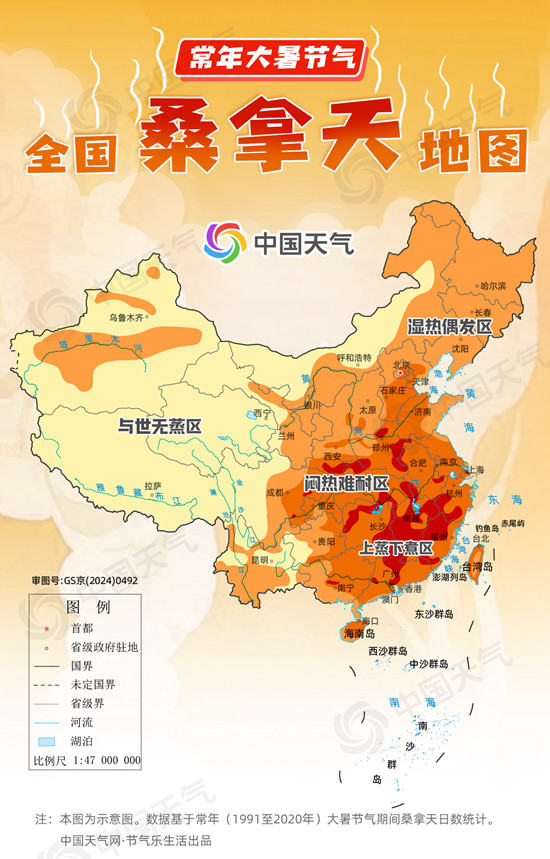 而在华北、黄淮等地,也会由于夏天风的突进,湿度增大,炽热感也不能够小看。华南一带则由于时有分散性雷雨或飓风等气候影响,终年大暑节气期间的桑拿天天数维持在5至7天左右。